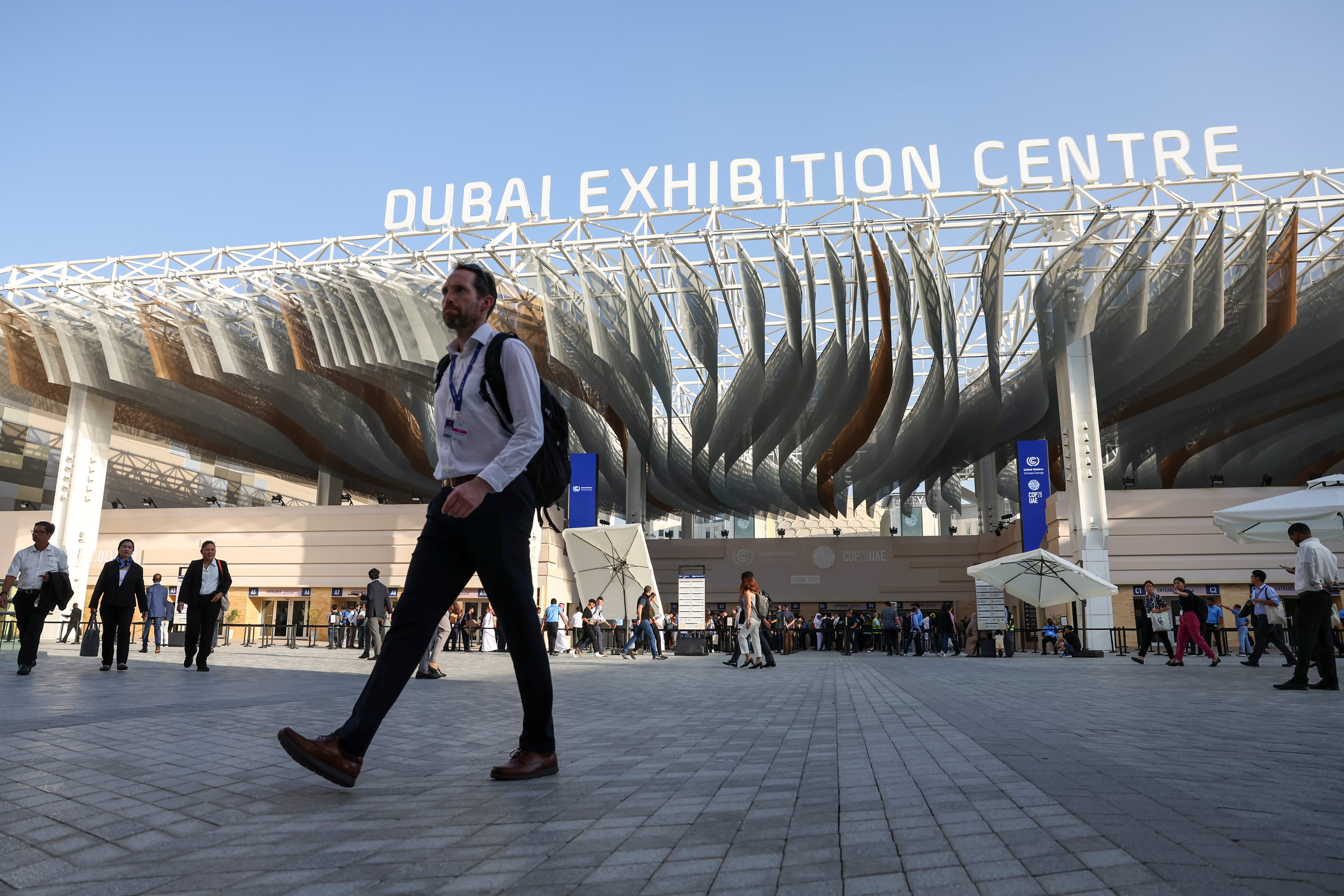 The Blue Zone entrance at the Dubai Exhibition Center ahead of the COP28 climate conference at Expo City in Dubai, United Arab Emirates, on Wednesday, Nov. 29, 2023. More than 70,000 politicians, diplomats, campaigners, financiers and business leaders will fly to Dubai to talk about arresting the world’s slide toward environmental catastrophe. Photographer: Annie Sakkab/Bloomberg via Getty Images