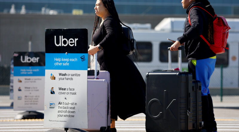 Travelers wait for an Uber ride-share vehicle at Los Angeles International Airport in Los Angeles on Feb. 8, 2023.
