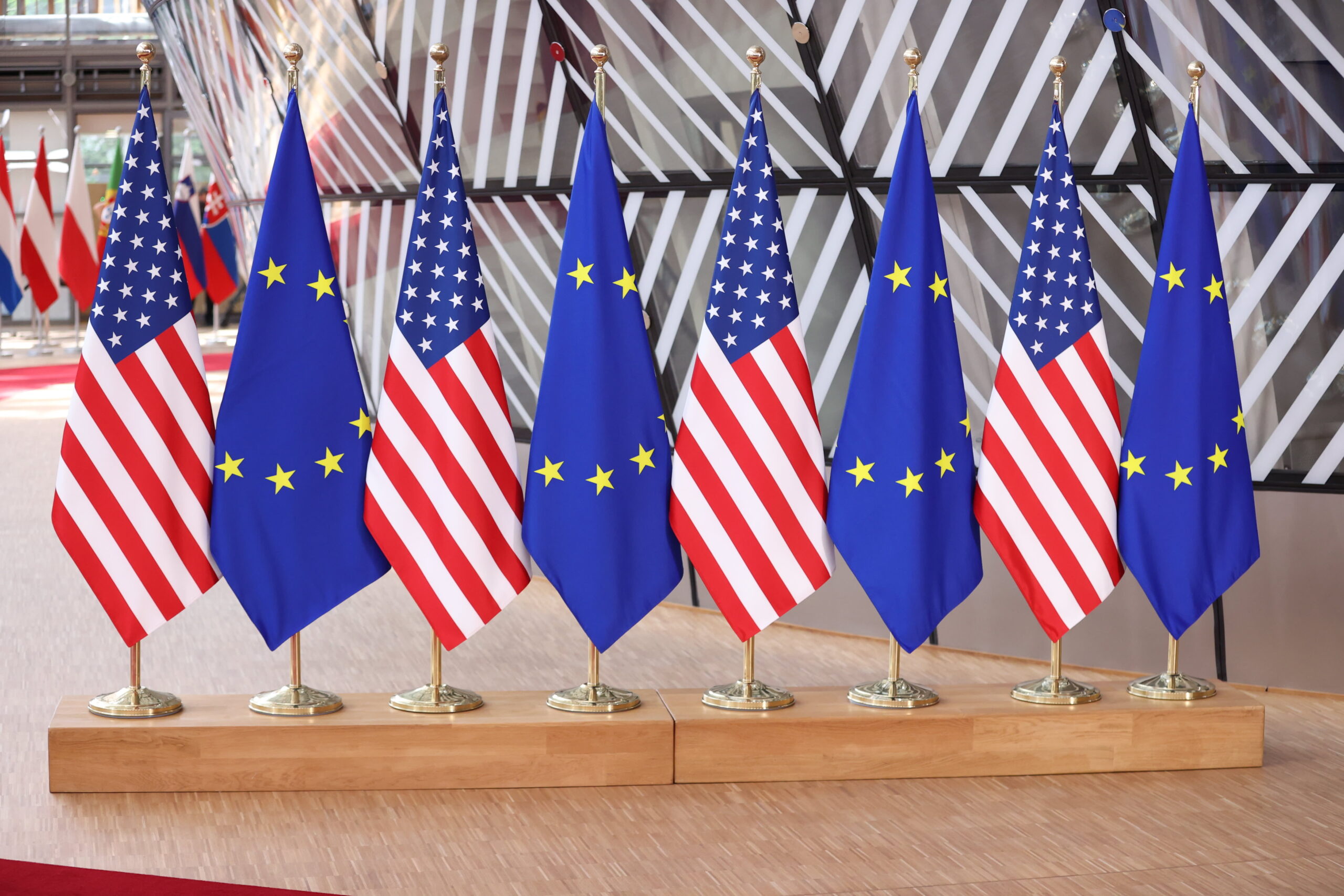 BRUSSELS, BELGIUM – JUNE 15: Flags are places at EU Council Building prior to the meeting of U.S President Joe Biden, European Council President Charles Michel and President of the European Commission, Ursula von der Leyen for US-EU Summit in Brussels, Belgium on June 15, 2021. (Photo by Dursun Aydemir/Anadolu Agency via Getty Images)