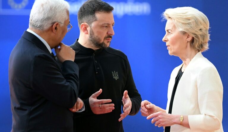 European Council President Antonio Costa, left, Ukraine’s President Volodymyr Zelensky, centre, and European Commission President Ursula von der Leyen have discussions at an EU summit. (Photo: AFP)
