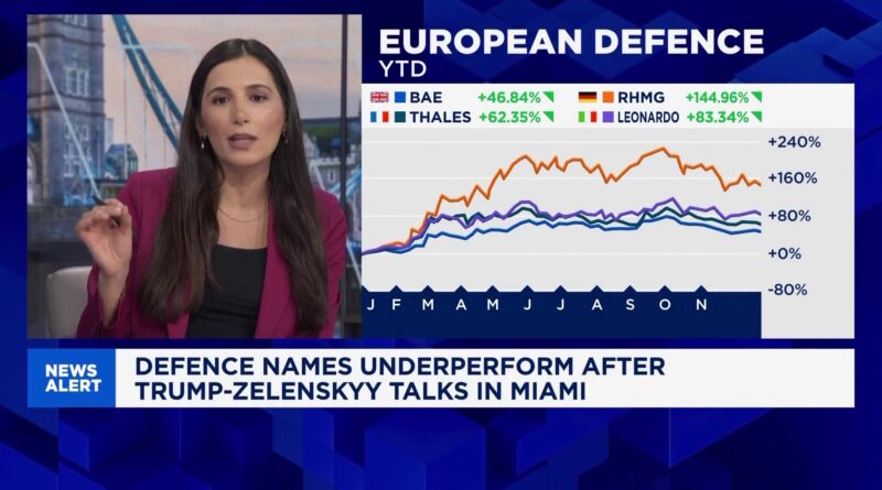 European defense stocks dipped following weekend peace talks between U.S. President Donald Trump and Ukrainian counterpart Volodymyr Zelenskyy.