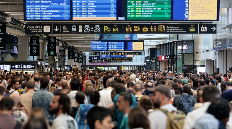 Passengers gather around the departure boards at the Gare Montparnasse train station in Paris on July 26, 2024 as France’s high-speed rail network was hit by malicious acts disrupting the transport system hours before the opening ceremony of the Paris 2024 Olympic Games.