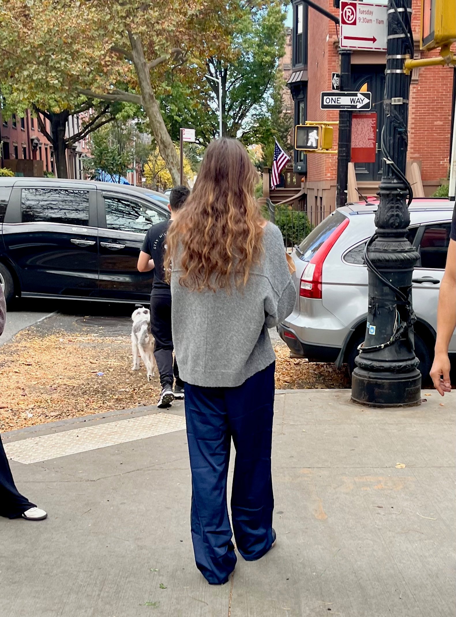 The other day, my friend and I were taking a walk when we spotted this lovely woman. How effortlessly chic is her pairing of a grey sweater with loose silk pants? I’d love to wear the combo as an everyday uniform — it would be perfect (and very comfy) for work, walks, dinners, drinks, long flights, everything.