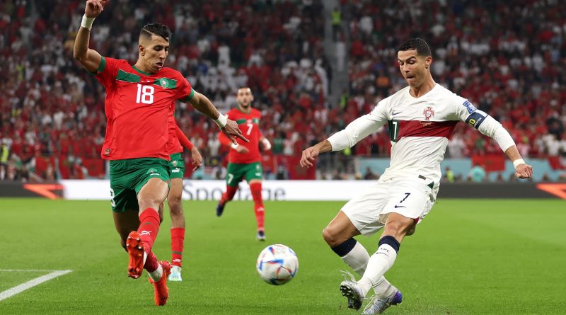 Cristiano Ronaldo of Portugal shoots past Jawad El Yamiq of Morocco during the FIFA World Cup Qatar 2022 quarter final match between Morocco and Portugal at Al Thumama Stadium on December 10, 2022 in Doha, Qatar. (Photo by Francois Nel/Getty Images)