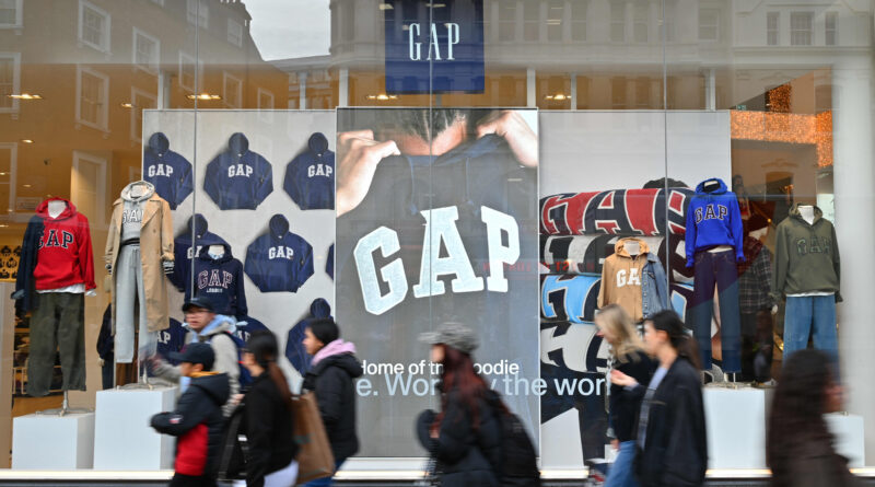 Shoppers walk past a GAP fashion retail store on Oxford Street on October 30, 2025 in London, United Kingdom.