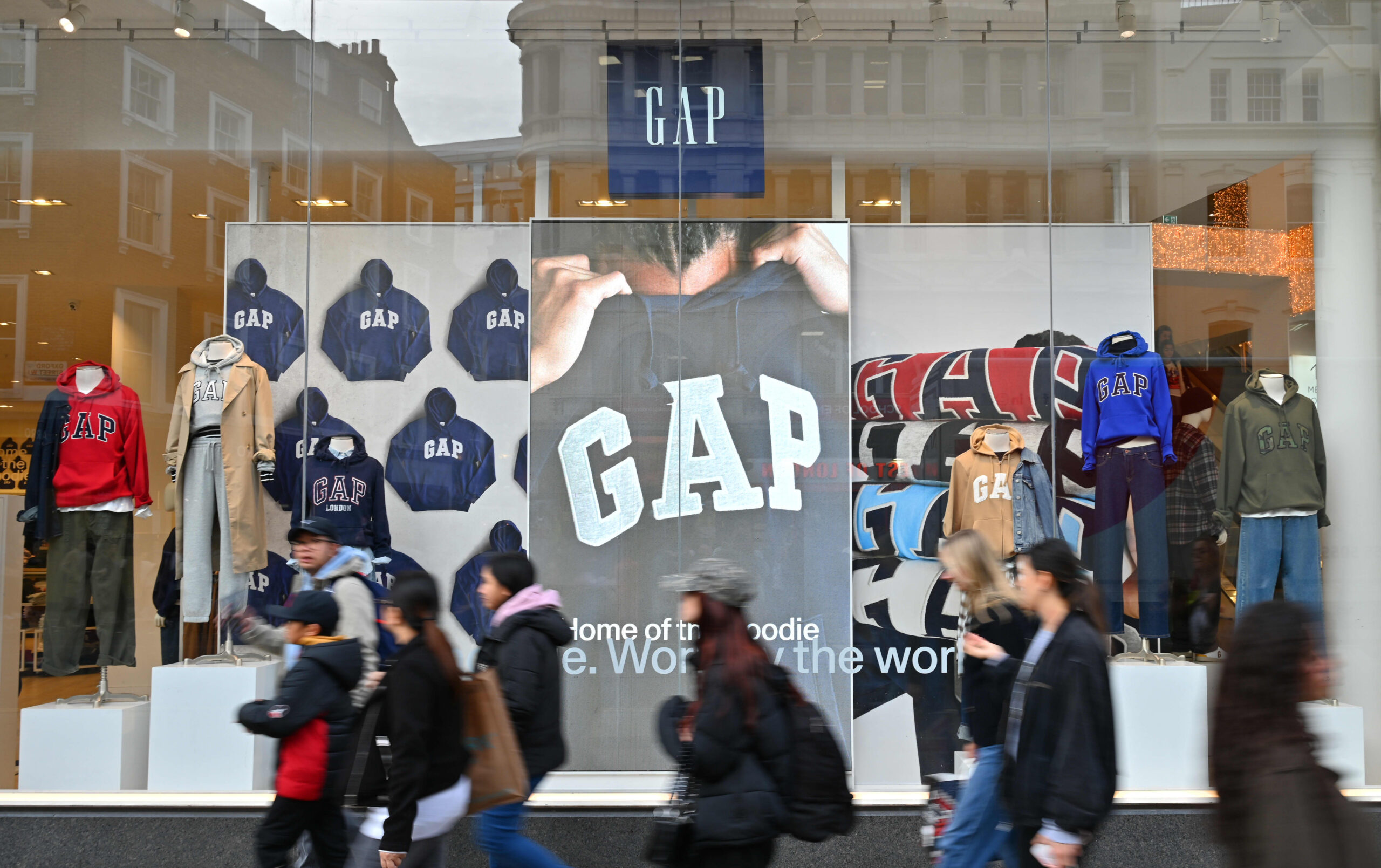 Shoppers walk past a GAP fashion retail store on Oxford Street on October 30, 2025 in London, United Kingdom.