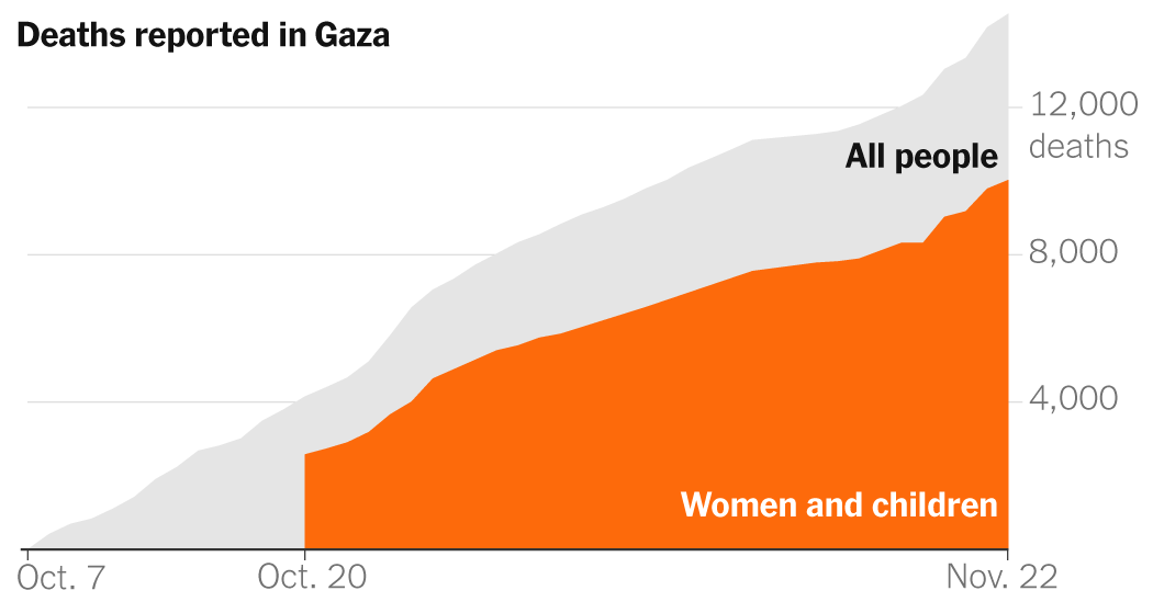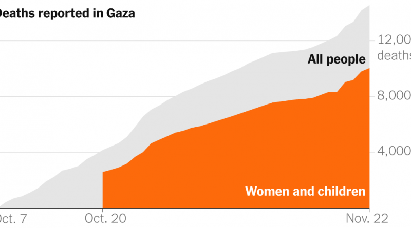 And the number of women and children reported killed in Gaza since the Israeli campaign began last month has already started to approach the roughly 12,400 civilians documented to have been killed by the United States and its allies in Afghanistan during nearly 20 years of war, according to Neta C. Crawford, co-director of Brown University’s Costs of War Project.