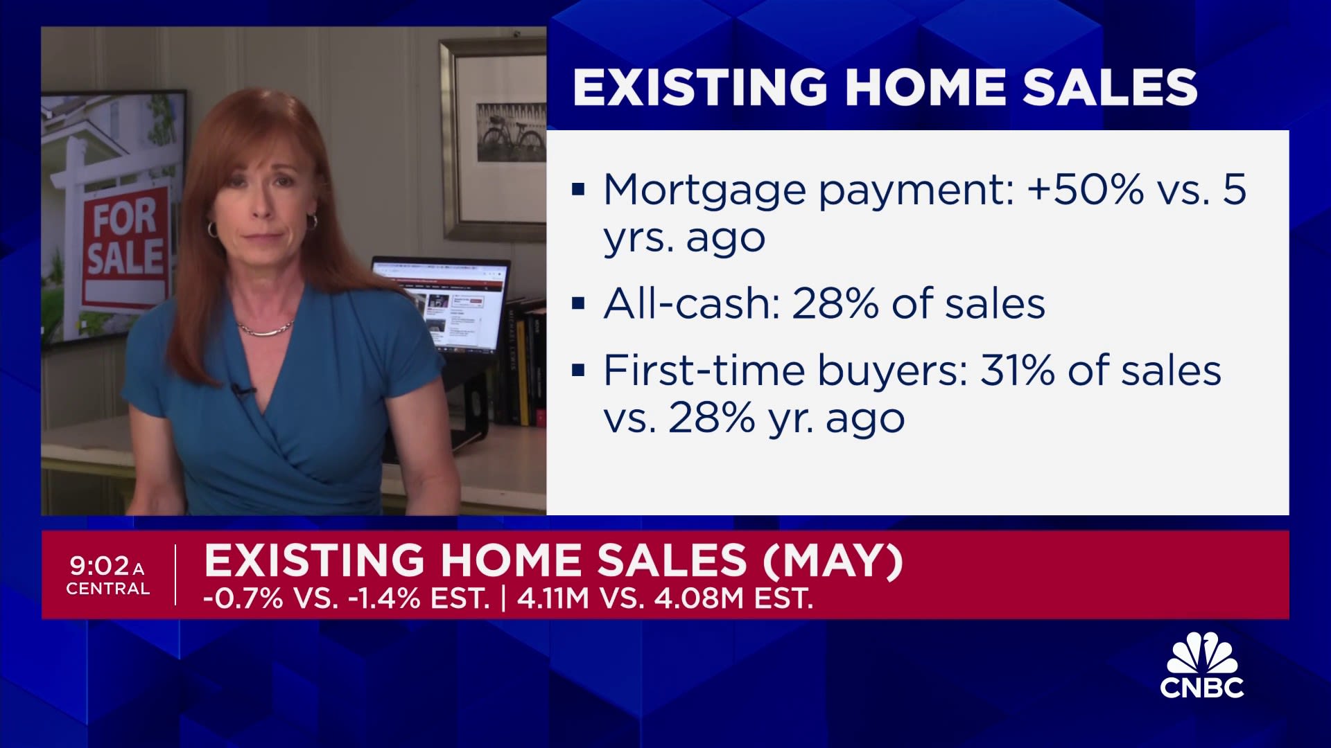 So-called existing home sales in May were essentially flat, down 0.7% from April to a seasonally adjusted, annualized rate of 4.11 million units, according to the National Association of Realtors, or NAR. Sales fell 2.8% from May of last year.