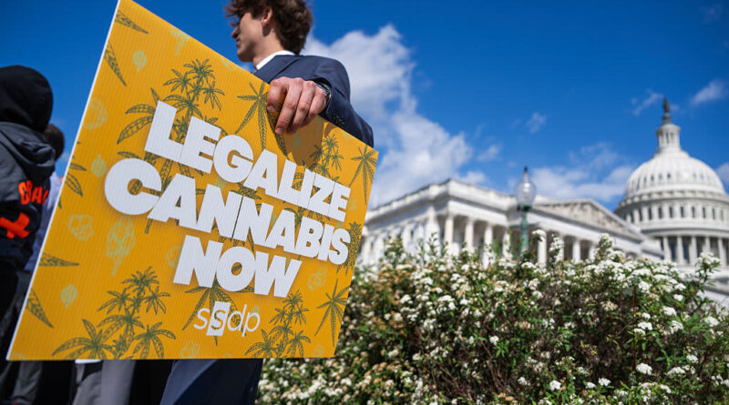 Advocates attend a news conference about the “impact of incarcerating those charged with marijuana-related offenses,” and policy reform ideas, outside the U.S. Capitol on April 20, 2026.