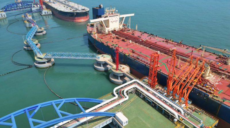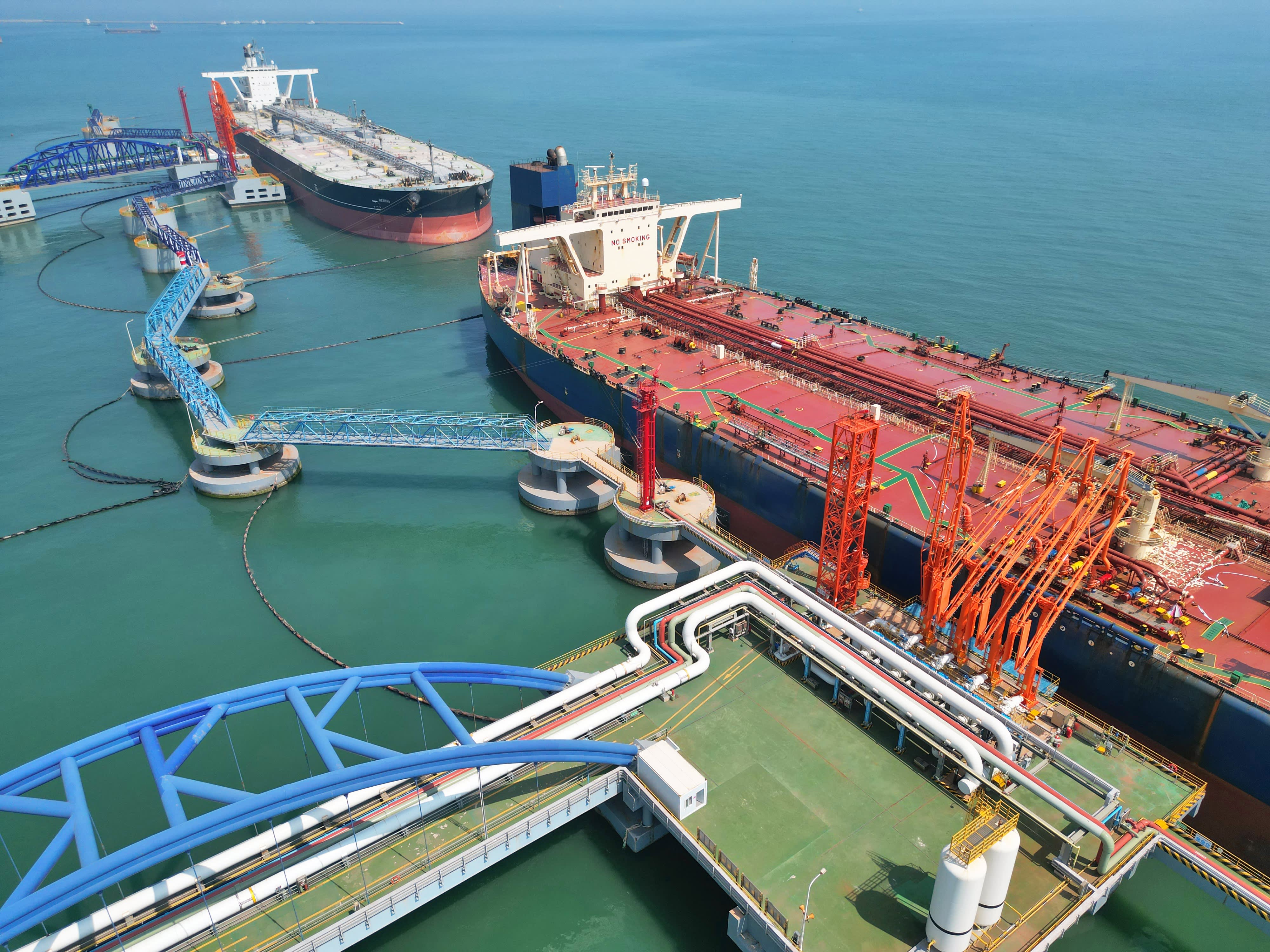 Two large oil tankers unload at the 300,000-ton crude oil terminal in Yantai Port, Shandong Province, China, July 9, 2023.