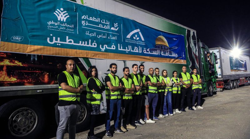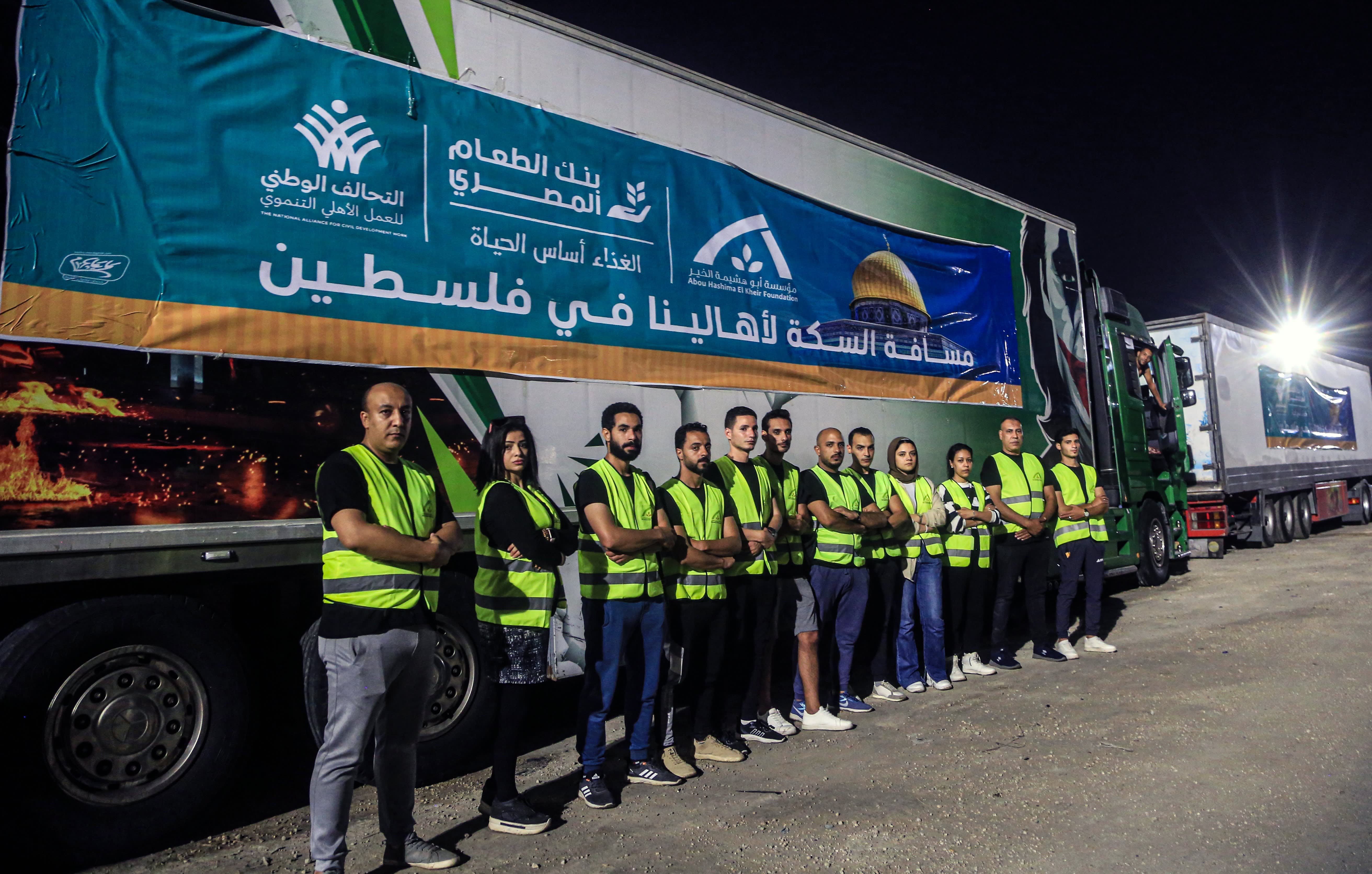 An Egyptian volunteer walks next to trucks carrying humanitarian aid from Egyptian NGOs for Palestinians, as they await for the reopening of the Rafah crossing at the Egyptian side to enter Gaza, amid the ongoing conflict between Israel and the Palestinian Islamist group Hamas, in Rafah, Egypt October 19, 2023.