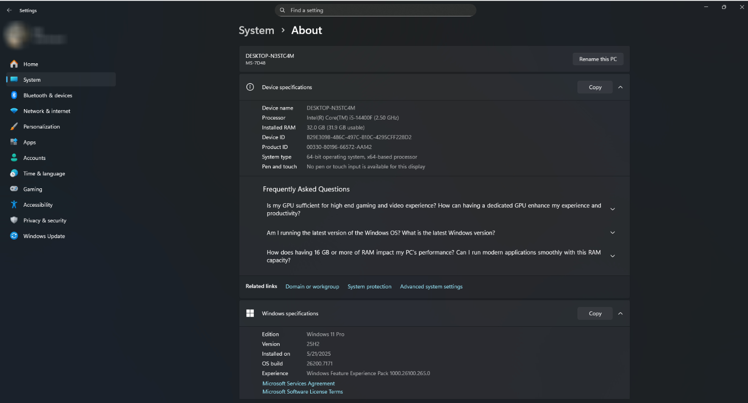 To check if your computer has the latest update, navigate to Settings, click on System, scroll down and click on About. Under the Windows specifications section, verify that the OS build number is 26200.7171 or higher.
