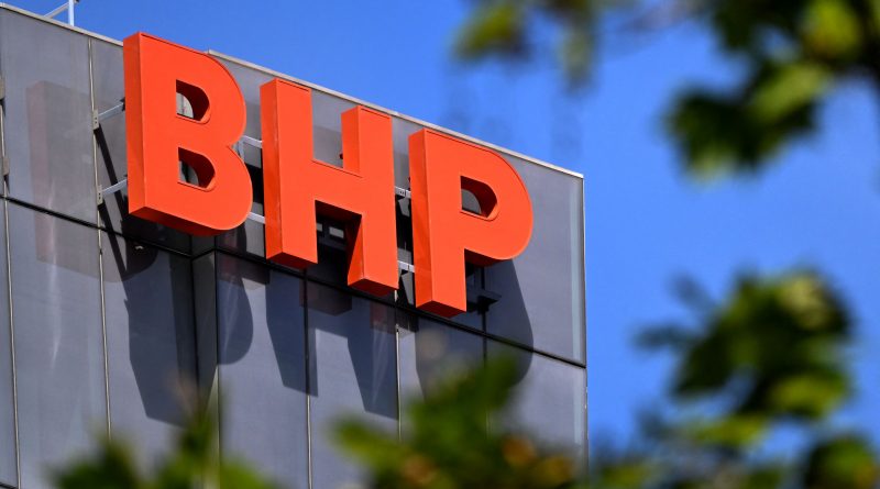 The company logo adorns the side of the BHP gobal headquarters in Melbourne on February 21, 2023. – The Australian multinational, a leading producer of metallurgical coal, iron ore, nickel, copper and potash, said net profit slumped 32 percent year-on-year to 6.46 billion US dollars in the six months to December 31. (Photo by William WEST / AFP) (Photo by WILLIAM WEST/AFP via Getty Images)