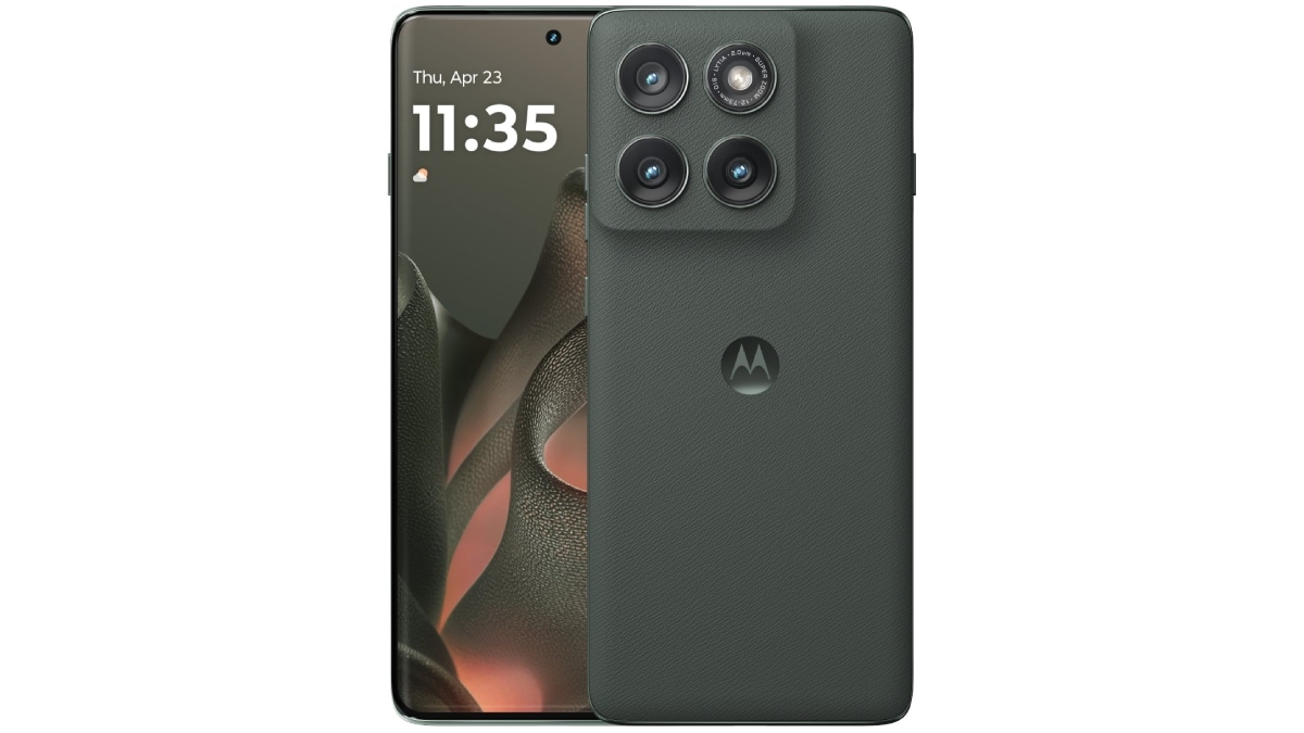 The right edge of the Motorola Edge 2025 appear to house the volume and power buttons. The back panel is seen with a vegan leather finish in a dark green colourway. The rear camera unit is placed within a slightly raised, seamless, squarish module and has three camera sensors alongside an LED flash unit.