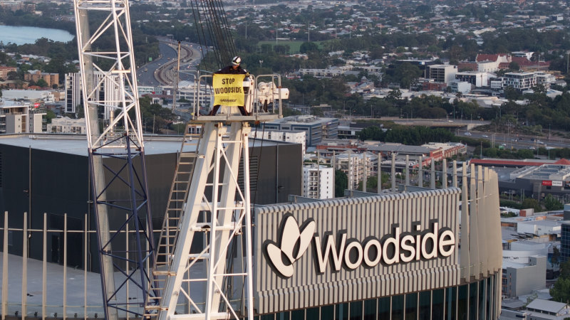Greenpeace activists protesting Woodside’s oil and gas operations have scaled a 140-metre crane alongside the company’s Perth headquarters.Source – Theage
