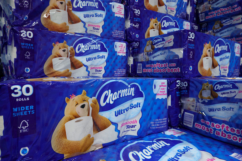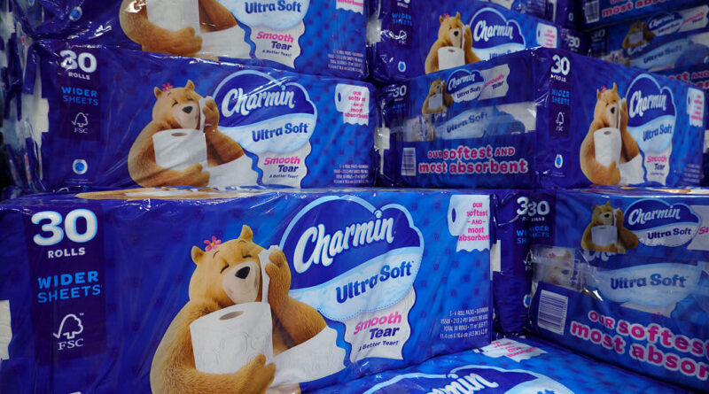 Packages of Charmin Ultra Soft bath tissue are stacked at a Costco Wholesale store in San Diego, California, on March 11, 2025.