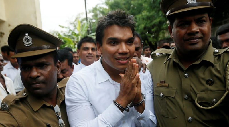 Namal Rajapaksa, the son of former Sri Lankan president Mahinda Rajapaksa, is escorted by prison officers after being arrested in Colombo on charges of money laundering in July 2016. He was acquitted in November last year. (Photo: Reuters)