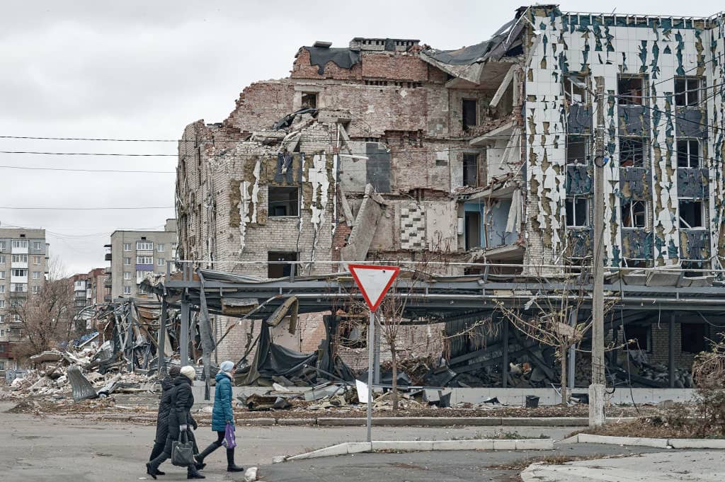 Local residents walk past destroyed houses in the city, approximately 10 km from the frontline, on November 16, 2024 in Pokrovsk, Ukraine.
