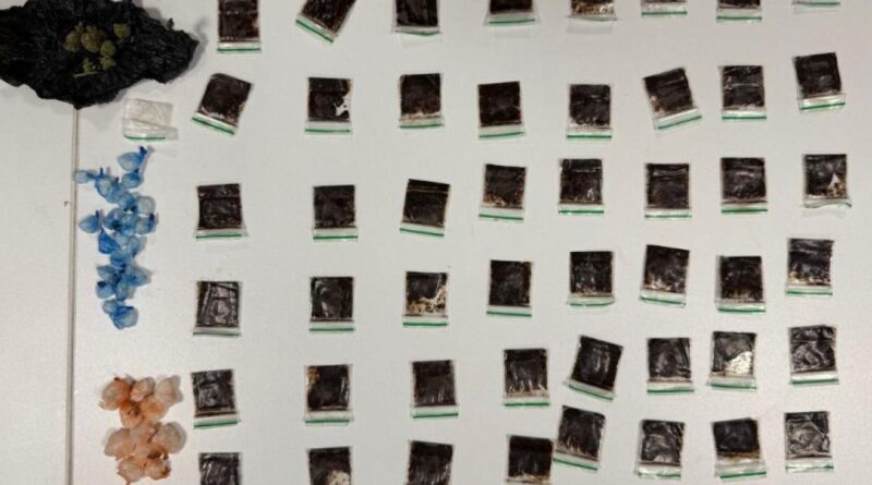 They say he was carrying 48 wraps of brown material and 33 wraps of white powder, both suspected of being Class A drugs, with a small amount of cannabis and a large hunting knife.