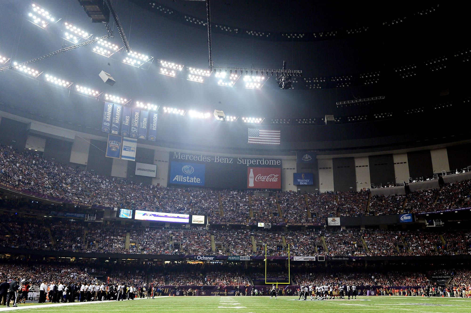 The Mercedes-Benz Superdome after a sudden power outage during Super Bowl XLVII. The stadium is now known as the Caesars Superdome.