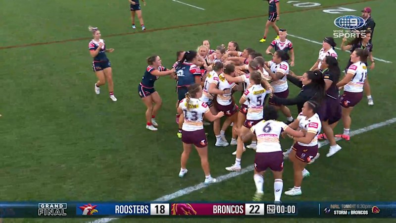 Broncos and Roosters players come together for a melee after the full-time siren in the grand final.Source – Theage