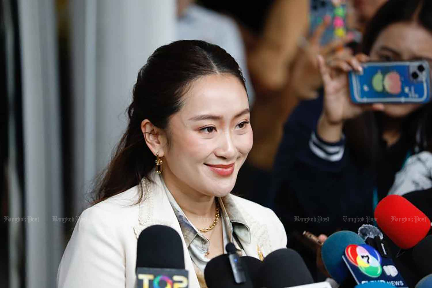 Prime Minister Paetongtarn Shinawatra meets reporters at the Pheu Thai Party headquarters in Bangkok on Aug 20. (Photo: Pattarapong Chatpatarasill)