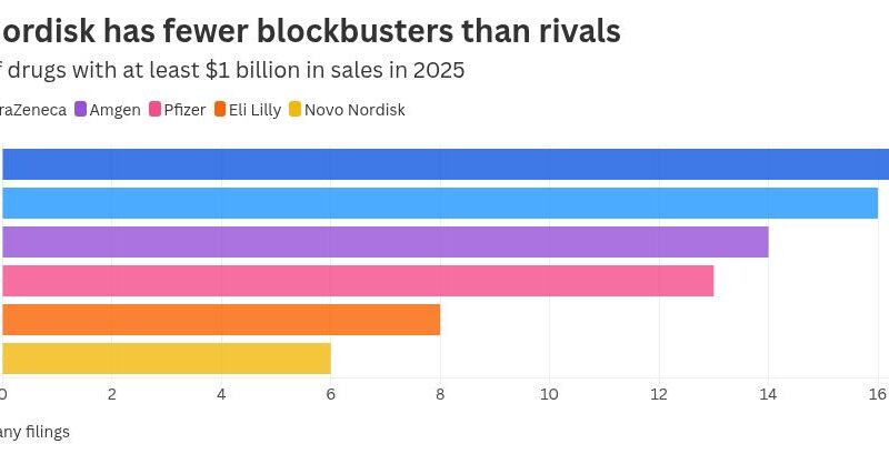 Novo Nordisk is often referred to as a diabetes and obesity pure play. Its portfolio included six branded drugs with annual sales of at least $1 billion in 2025, fewer than comparable current and future rivals.