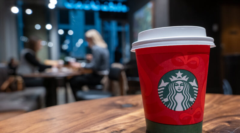 A Starbucks coffee cup sits on a table inside a Starbucks in New York on Dec. 2, 2025.