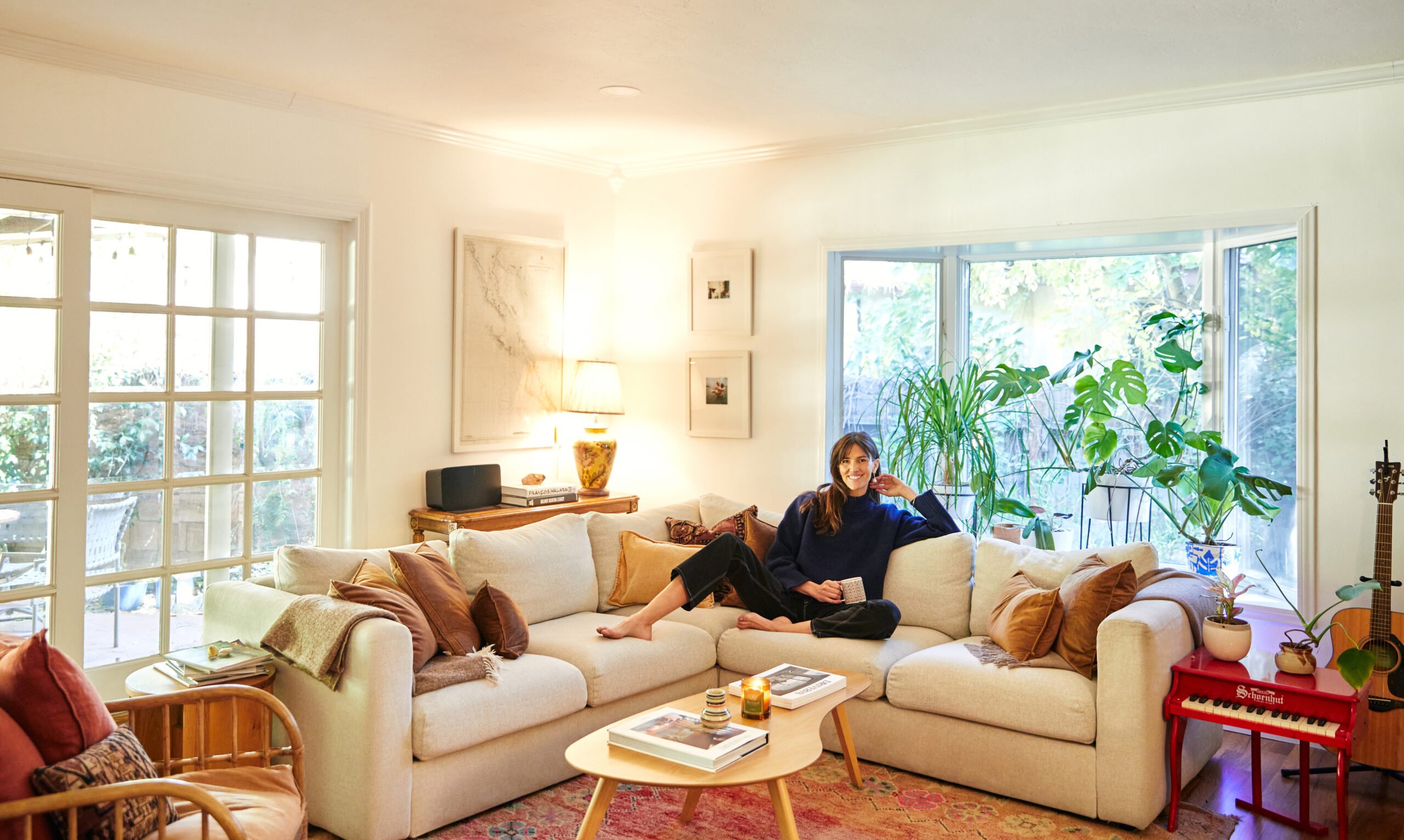 Sofa: Ikea. Coffee table: Wayfair. Candle: The Post Supply. Rattan armchair: Ikea. Rug: vintage. Kids’ piano: family hand-me-down. Print: from “Living on The Earth” by Alicia Bay Laurel.