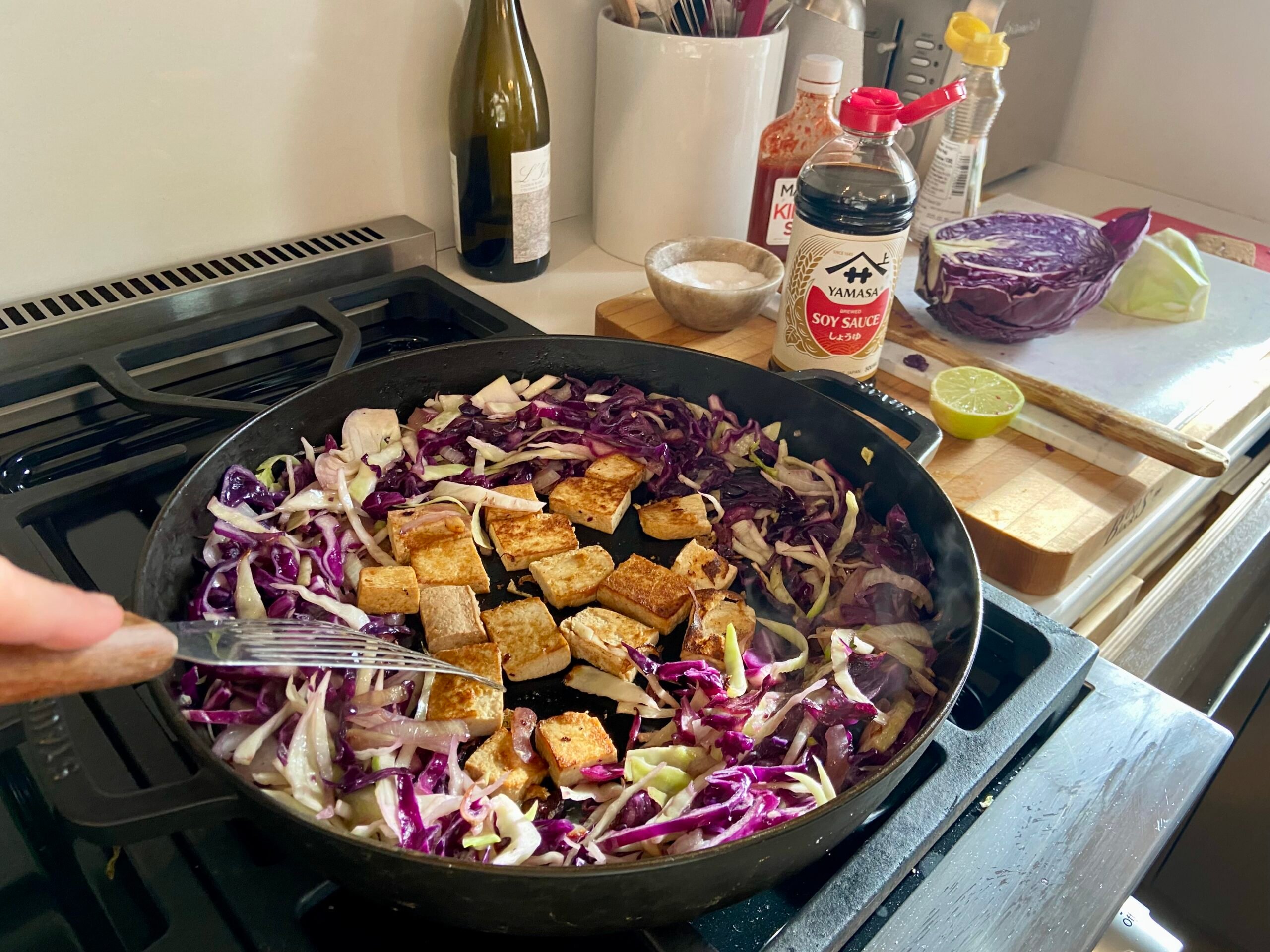 The recipe: Add half an onion (sliced), an inch of fresh ginger (minced) and a clove of garlic (minced) to neutral oil in a large skillet set over medium heat. After they soften a bit, add a small head of cabbage, shredded (I used half a head of red and half a green cabbage here but you can use whatever combination you want). Cook down the cabbage until it gets caramelized and wilted (about 10 minutes), then move to the perimeter of the pan to expose the middle surface. Add a little more oil, then pan-fry sliced tofu (one 7-ounce package is enough to serve two people in my house) for about 2 minutes a side until golden. Toss everything together with a drizzle of soy sauce, a squeeze of fresh lime juice. Serve with: toasted sesame seeds and Kimchilli sauce (or sriracha or your favorite hot sauce).