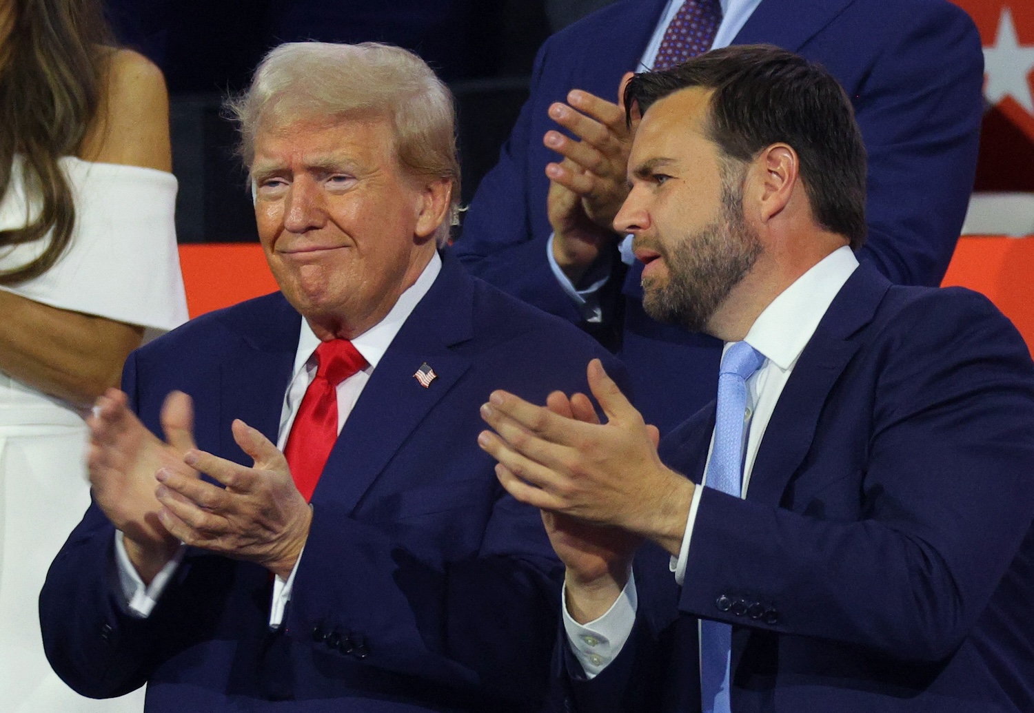 Presidential nominee Donald Trump and vice presidential nominee JD Vance applaud a speaker on Day 1 of the Republican National Convention, at the Fiserv Forum in Milwaukee, Wisconsin, on Monday. (Photo: Reuters)