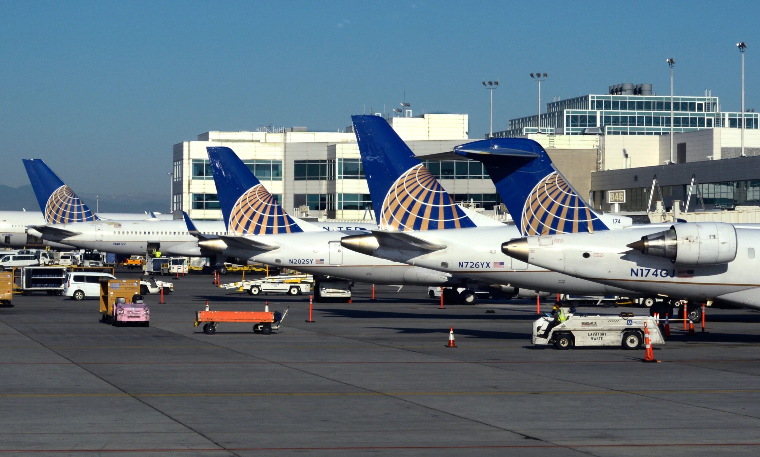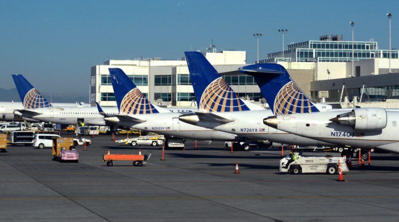 A row of United Airlines passenger planes parked at gates at Denver International Airport in Denver, Colorado.