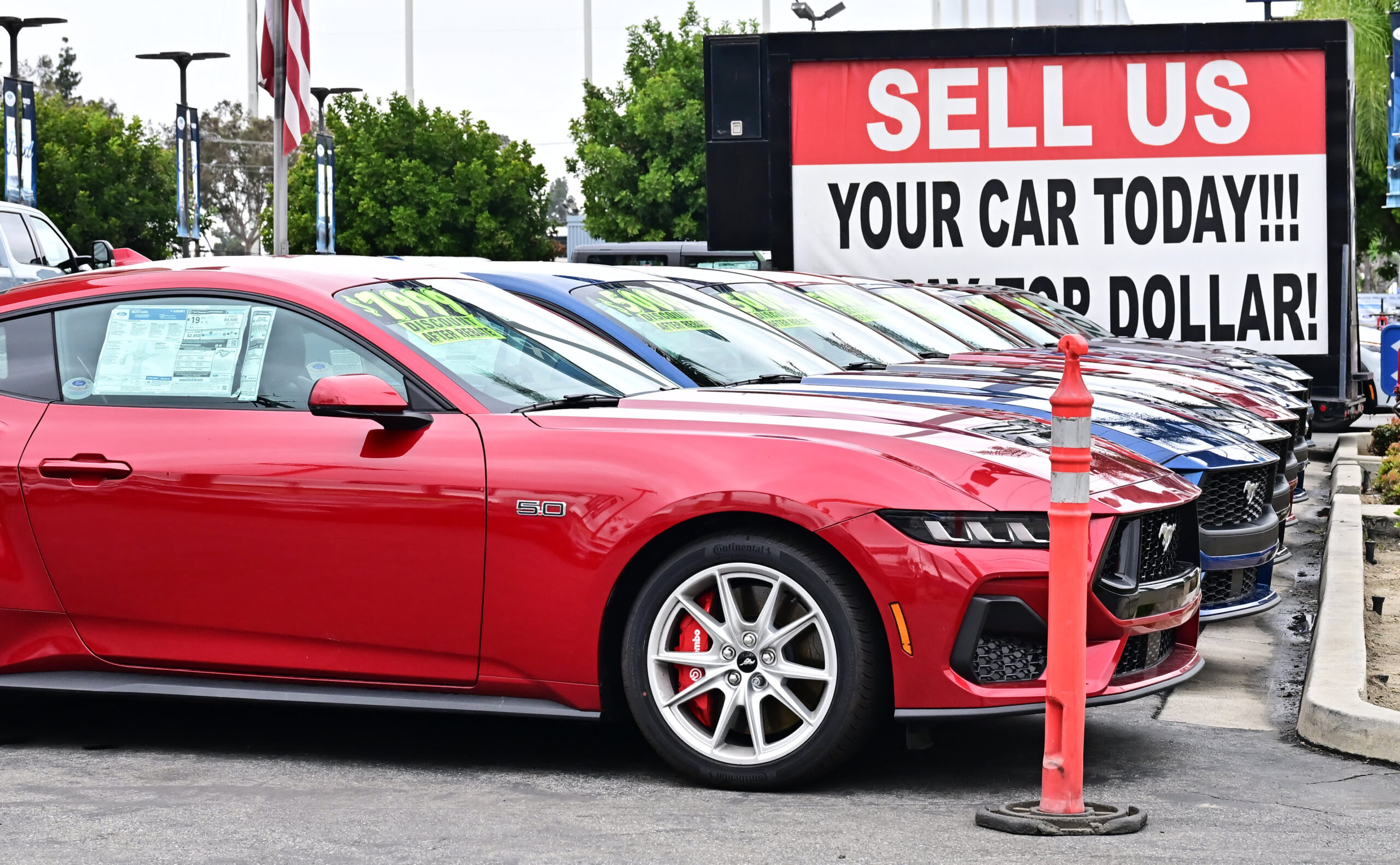 A Ford mustang is seen at a used car dealership in Montebello, California on May 5, 2025.