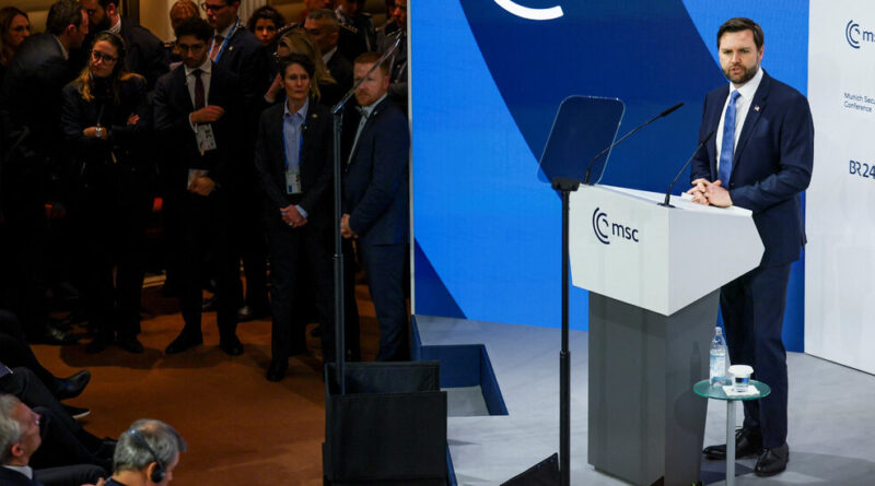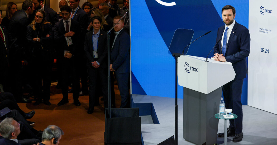 The address stunned and silenced hundreds of attendees at the Munich Security Conference, a forum where top-level politicians, diplomats and analysts had gathered expecting to hear President Trump’s plans for ending the war in Ukraine and Europe’s defense against a rising Russian threat.