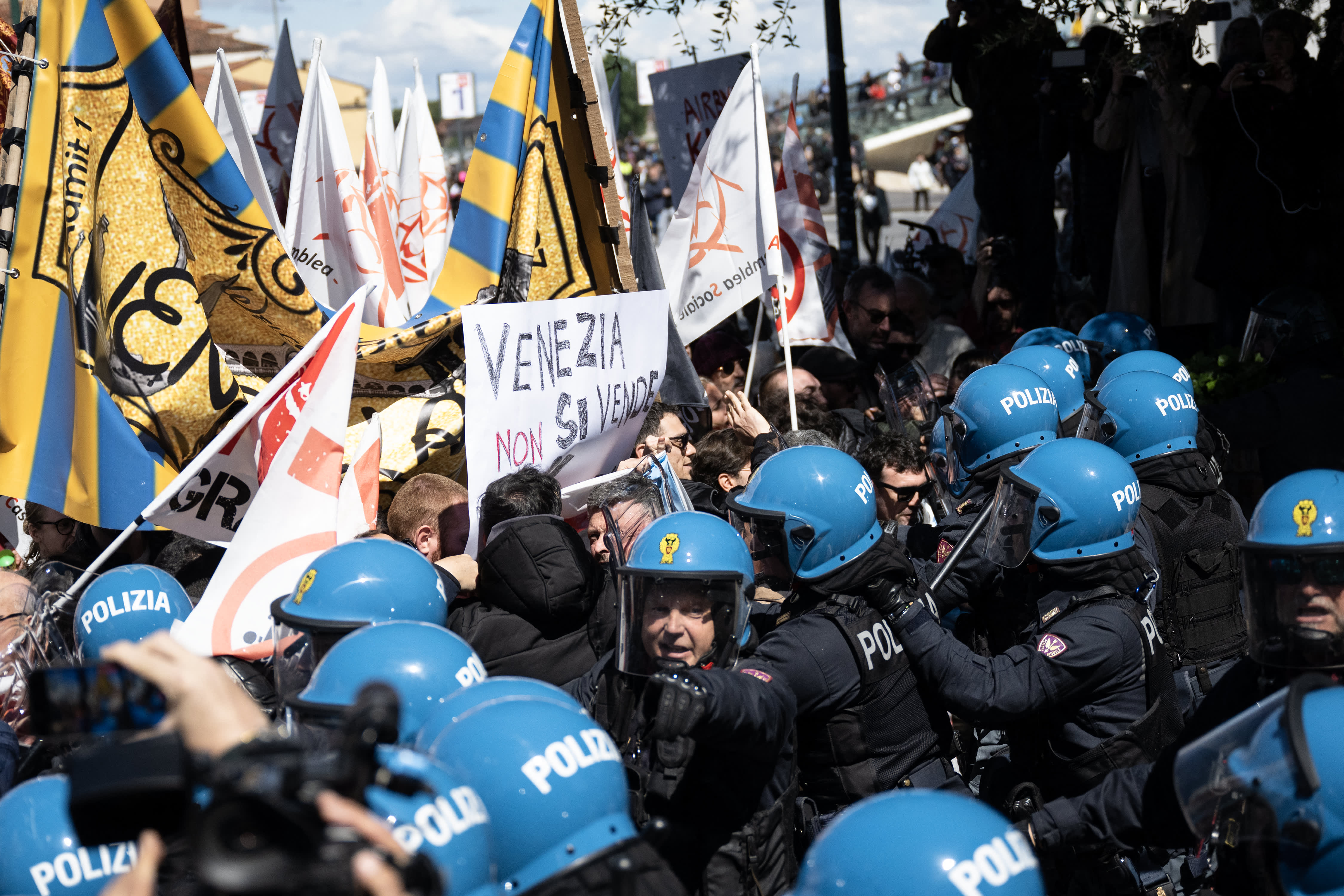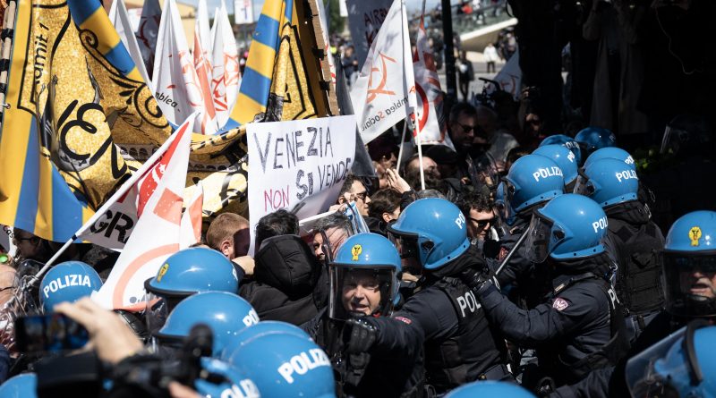 Protestors clash with riot police officers during a demonstration against the new “Venice Access Fee”, organised by the list “Tutta la citta’ insieme” (The whole city together) and members of several Venetians trade associations in “Piazzale Roma” in Venice, on April 25, 2024. Venice launched a new scheme to charge day-trippers for entering the historic Italian city, a world first intended to ease the pressure of mass tourism , but many residents are opposed, in Venice, on April 25, 2024.