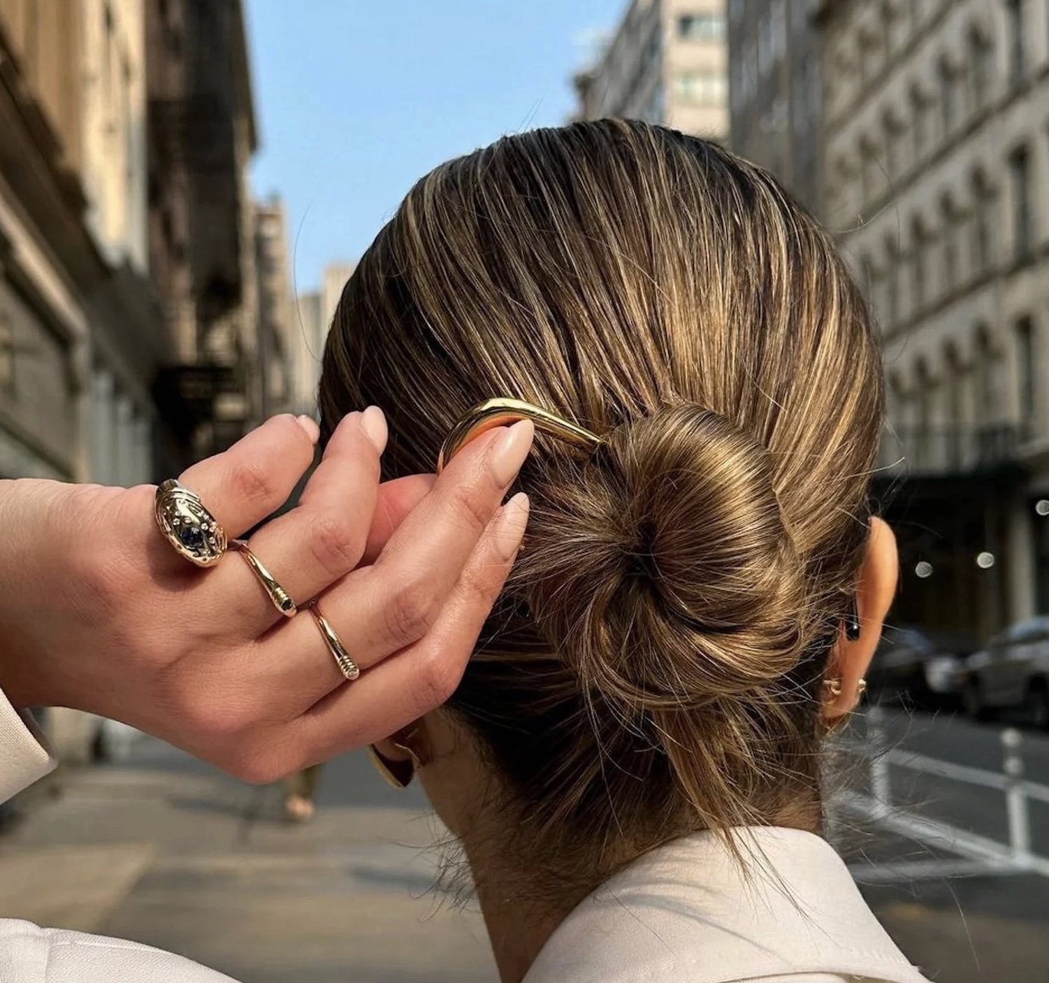 For the past year, I’ve been a fan of claw clips (wear my hair like Rachel Green? Yes, please.) But lately, I’ve been seeing photos of women with sleek buns and romantic twists, and peeking out the top is the elegant curve of a French pin. Here are a few:
