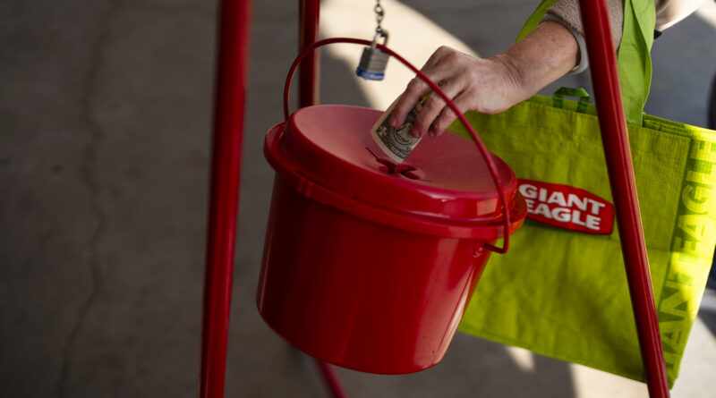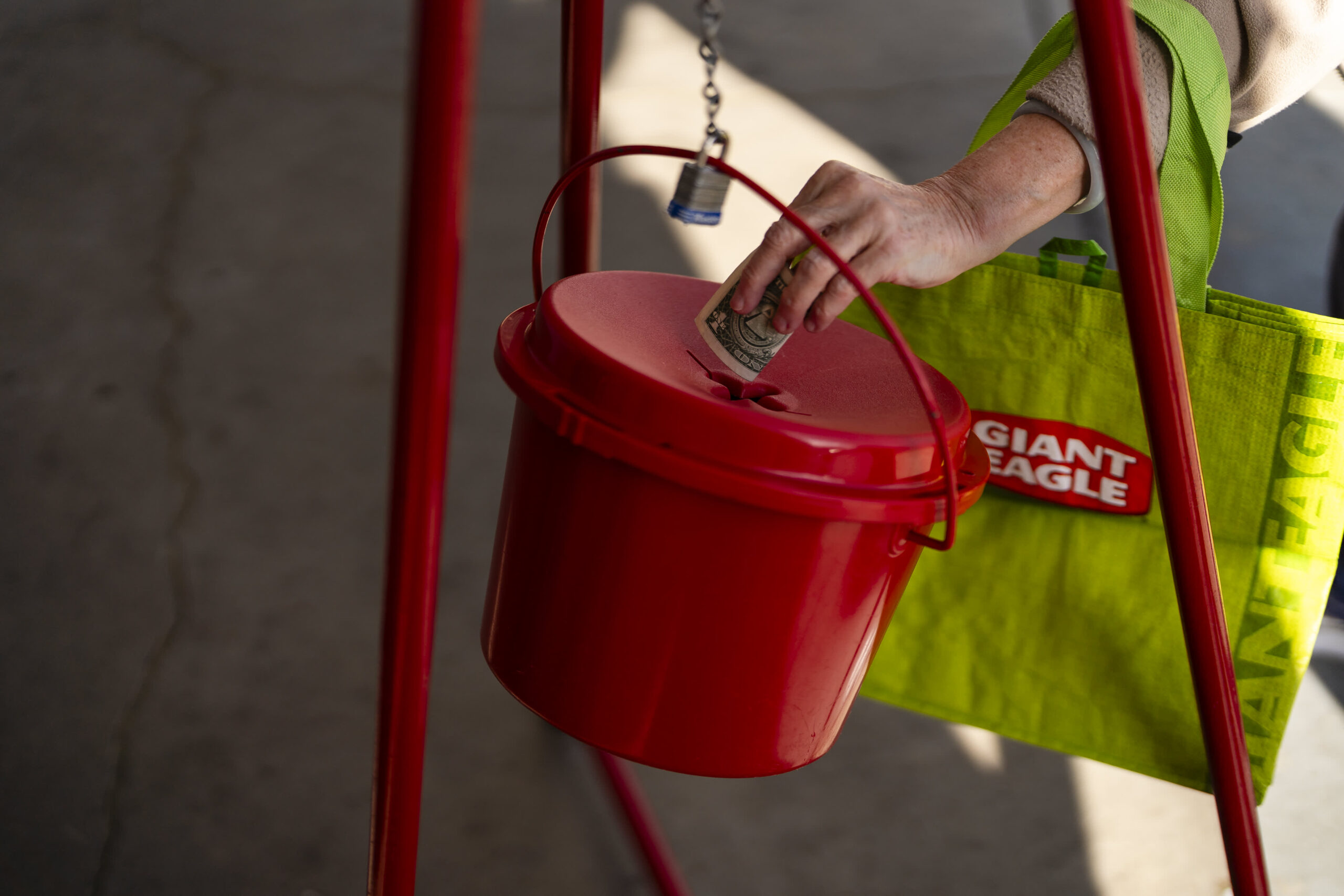 A woman puts money into a Salvation Army red kettle outside of Giant Supermarket in Alexandria, Virginia on November 22, 2023.
